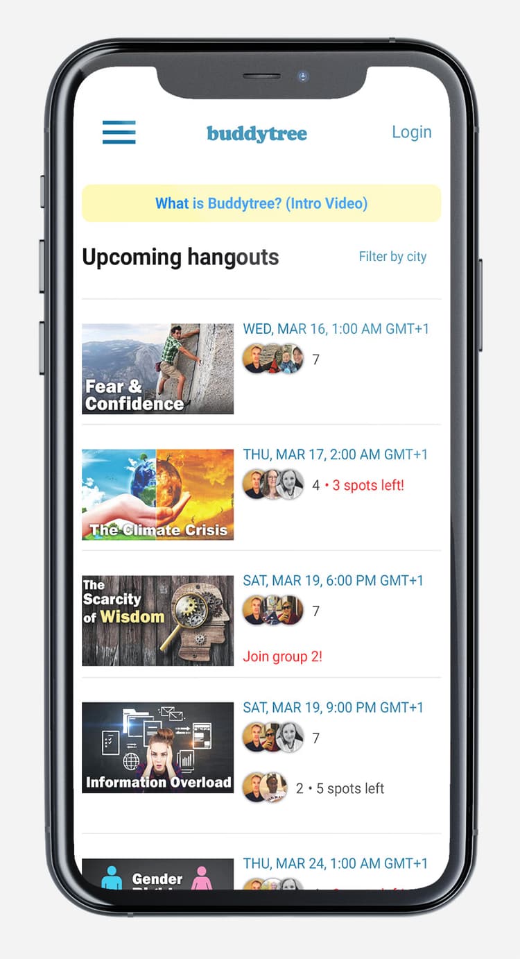 GET STARTED FOR FREE“The buddytree hangouts have been great for making friends locally as well as internationally. Each time I meet my buddies, we have deeper and more meaningful conversations.”